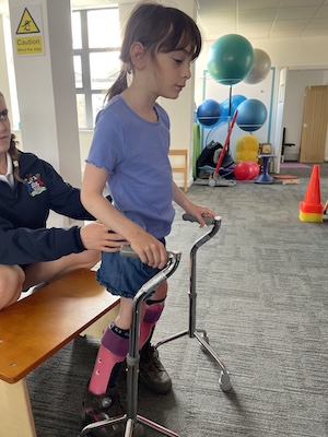 This little girl had grown out of her sticks and the next size up are way too bulky. She also struggled to keep the sticks in alignment due to her arm posture. Dave helped by raising the existing stick heights and providing optional handle angles. She can now continue to progress her walking and not catch her feet on the stick bases.